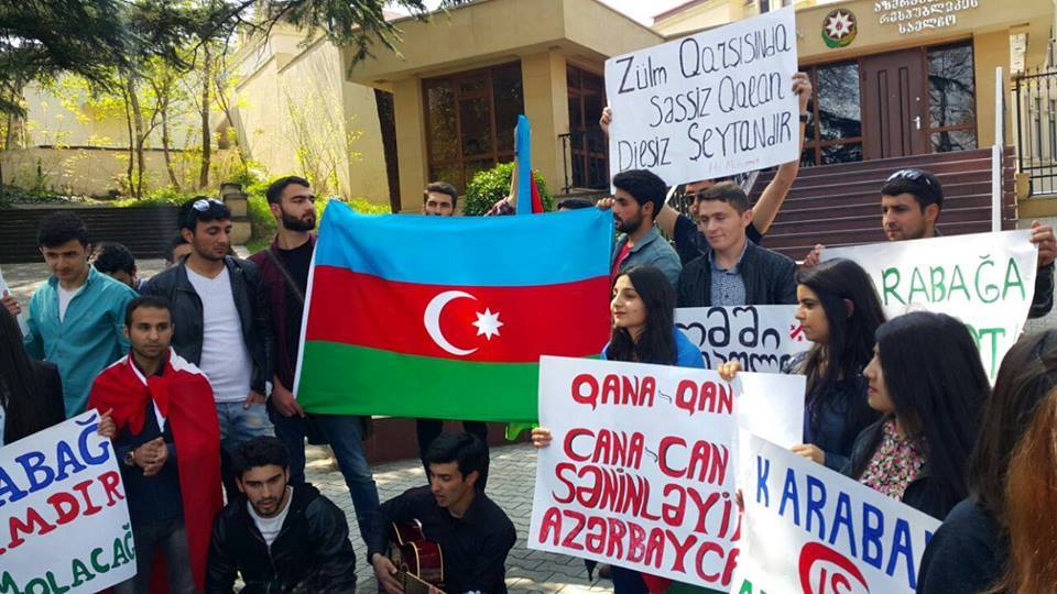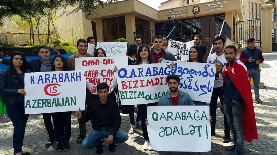 Gürcüstanın Azərbaycandakı səfirliyi qarşısında Azərbaycanın dövlət himnini oxuduqdan sonra “Qarabağ bizimdir, bizim olacaq!”, “Qarabağ Azərbaycanındır!”, gürcü dilində yazılan “Abxaziya və Osetiya, Qarabağa həmrəylik!” sözləri yazılan şüarlar səsləndirilib.